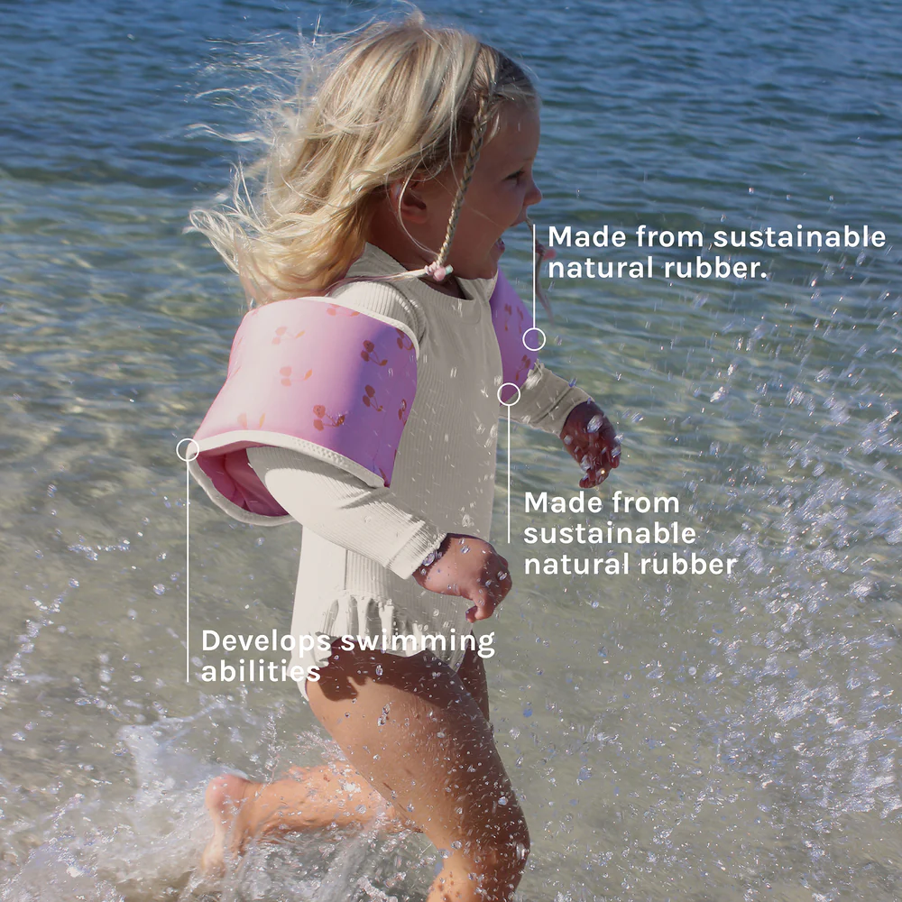 Estos flotadores infantiles favorecen el desarrollo de las habilidades de natación gracias a su correa ajustable y segura, y están fabricados con caucho natural sostenible y espuma para una flotabilidad, comodidad y durabilidad