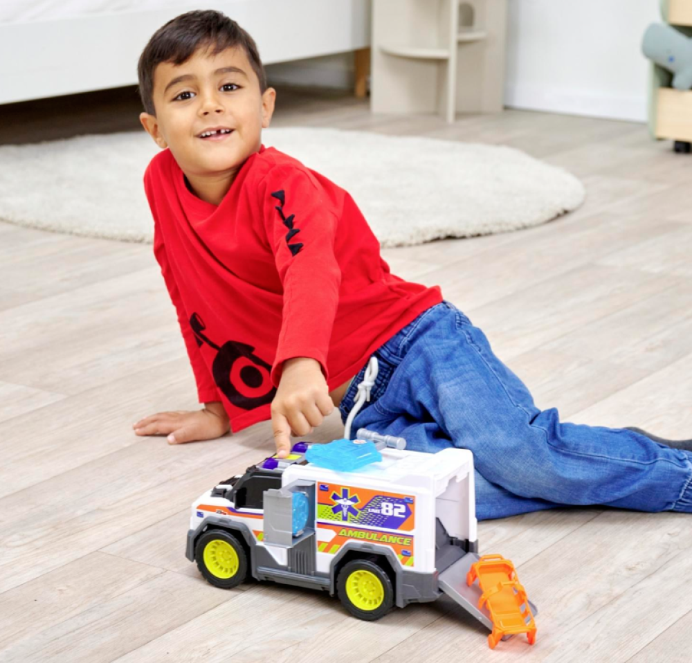 Esta robusta ambulancia de primeros auxilios cuenta con un compartimento lateral y un portón trasero que se convierte fácilmente en rampa, ideal para cargar y descargar rápidamente la camilla incluida. La luz azul intermitente, los sonidos realistas del arranque del motor, el ruido de marcha y la impresionante sirena hacen que cada rescate sea aún más emocionante.