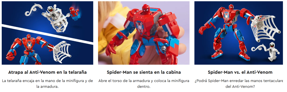 - Set LEGO® Marvel Armadura Robótica de Spider-Man vs. el Anti-Venom: Este juguete infantil construible viene con una gran figura de una armadura robótica y 2 minifiguras listas para proporcionar diversión a los niños y las niñas a partir de 6 años