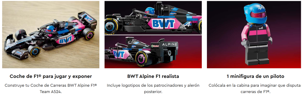 - Vehículo de F1® Alpine de juguete para peques: Set LEGO® Speed Champions Coche de Carreras BWT Alpine F1 Team A524 para niños y niñas a partir de 10 años, diseñado para construir, exponer y competir