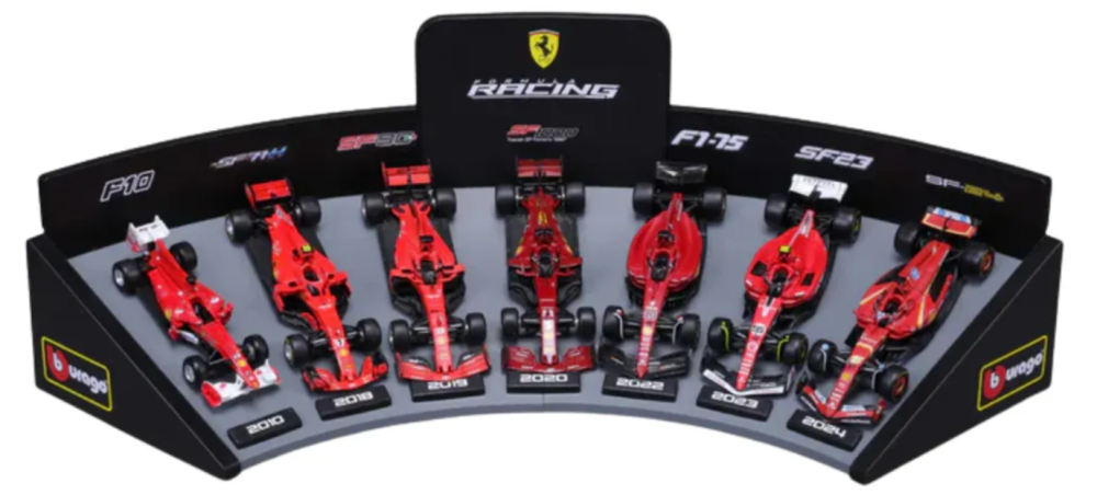 Bburago presenta un set exclusivo para los entusiastas de Ferrari y la Fórmula 1: un set con 7 miniaturas a escala 1:43, acompañado de una vitrina para una exhibición única.