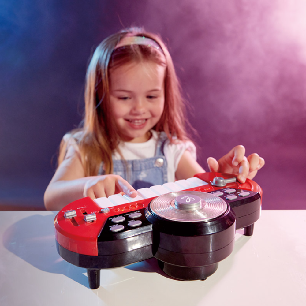 ¡Incluye un bombo, una caja, un tom drum, un platillo, pedal, taburete, un par de baquetas y un teclado con mucha música y ritmos divertidos!