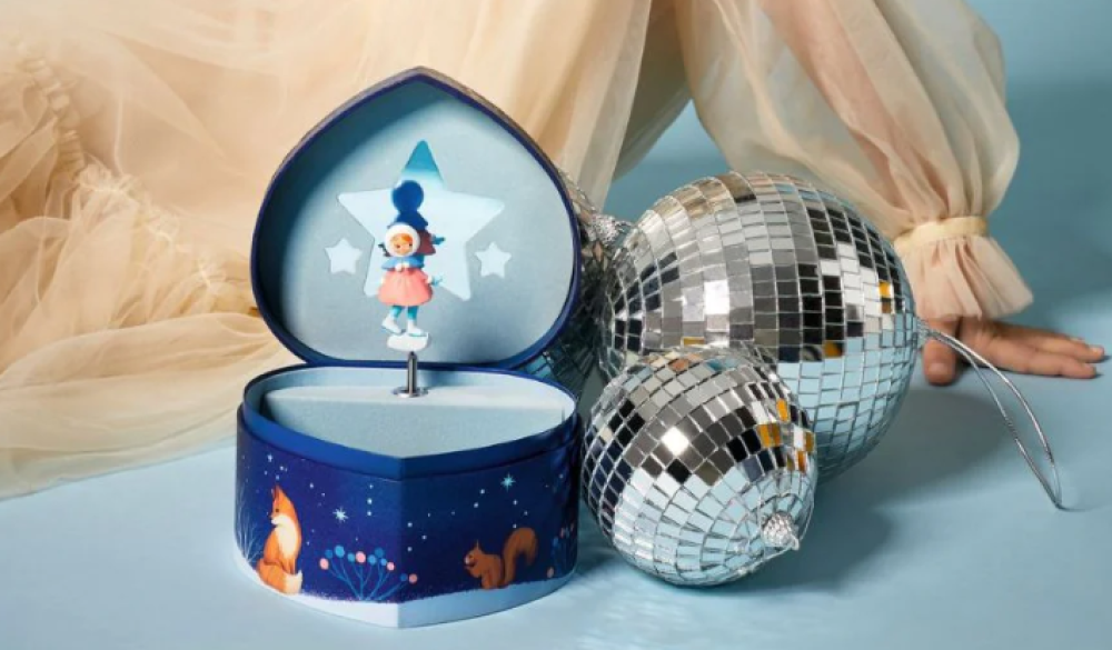 Gira la manivela y ábrela para descubrir una delicada figura de una patinadora artística que, reflejada en un espejo con forma de corazón, suena al son de «Let Me Call You Sweetheart» de Leo Friedman.