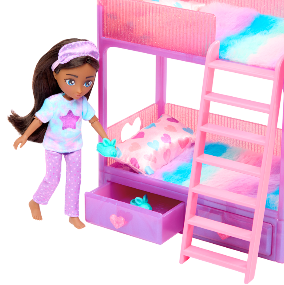 ¿Quién se queda con la cama de arriba? ¡Tú decides! La litera Nighty Night es imprescindible en cualquier casa de muñecas. ¡No requiere ensamblaje! Crea un mundo de amistad y diversión con todas las muñecas y sets de juego de Hey Bestie.
