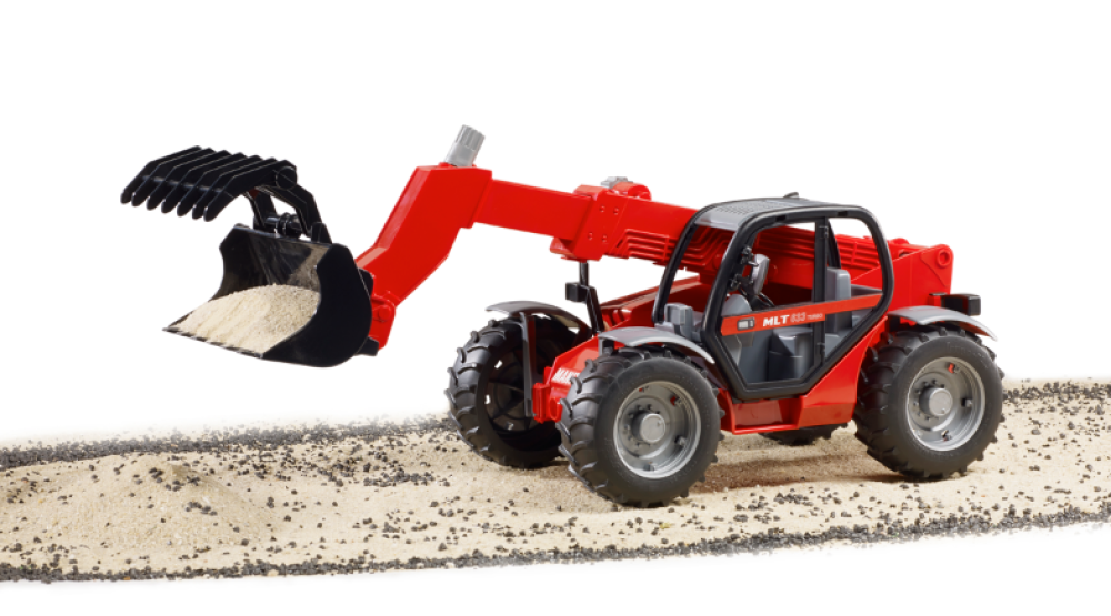 El brazo telescópico se puede extender y su altura se ajusta con el mando giratorio superior. El ángulo de la pinza de la cuchara también se puede ajustar y se puede desmontar con el mando giratorio lateral. El capó del motor se puede abrir y los neumáticos con banda de rodadura completan el conjunto.