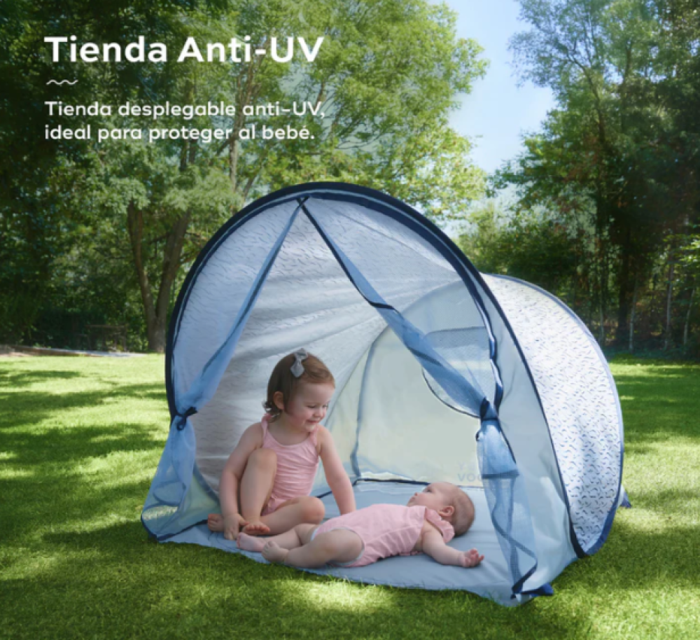 Además de una crema solar de alta protección, gafas y sombrero, una zona de sombra adecuada como esta tienda anti-UV es esencial para disfrutar al aire libre con seguridad.