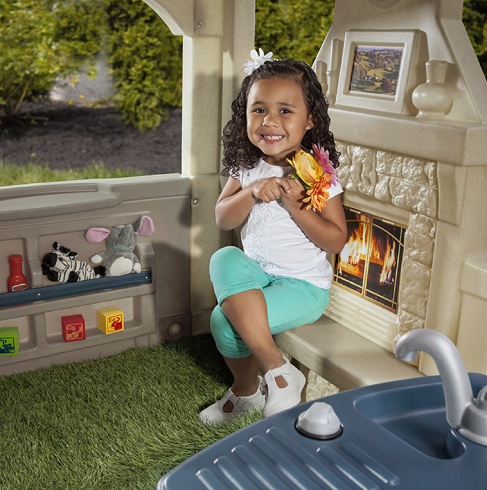 El diseño abierto de la Charming Cottage™ de Step2 permite interacciones en todo momento a través de la entrada de estilo holandés, las grandes ventanas abiertas y la mesa al aire libre. Cuando los amigos llegan para jugar, pueden anunciar su llegada con el timbre que funciona de verdad.