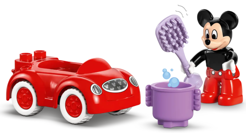 2 conocidos personajes: Una figura LEGO® DUPLO® de Mickey Mouse y un elemento que representa a Toodles, además de una versión de juguete construible del coche rojo de Mickey Mouse que aparece en la serie de Disney Junior La casa de Mickey Mouse