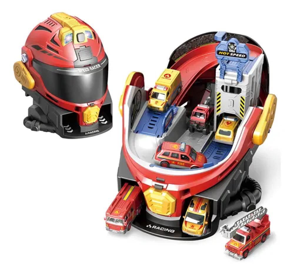 Un casco que se transforma en un aparcamiento único con 4 coches en miniatura para jugar de forma divertida.