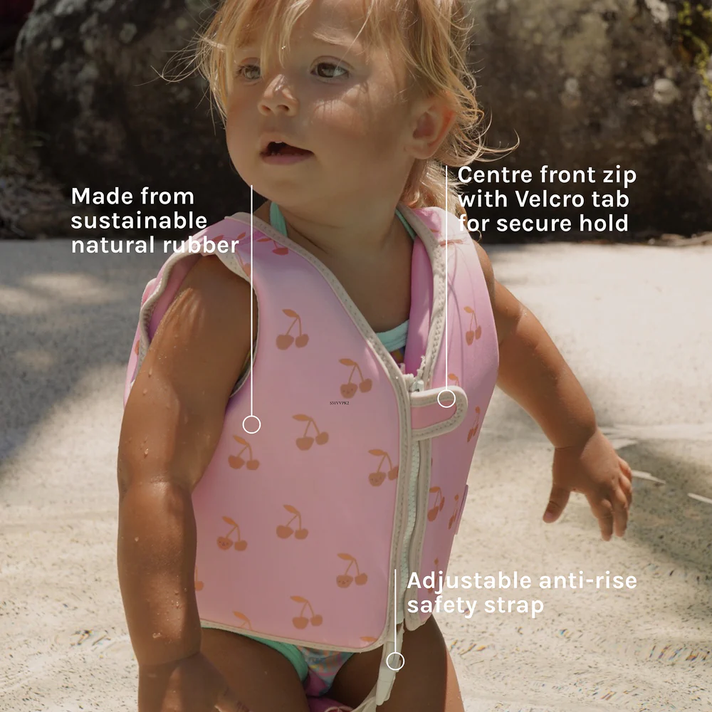 Este chaleco de natación para niños cuenta con una correa de seguridad anti-elevación, protección de neopreno cómoda y cierre seguro con pestaña de velcro hecho de caucho sustentable para brindar seguridad y confianza a los pequeños aprendices al nadar.