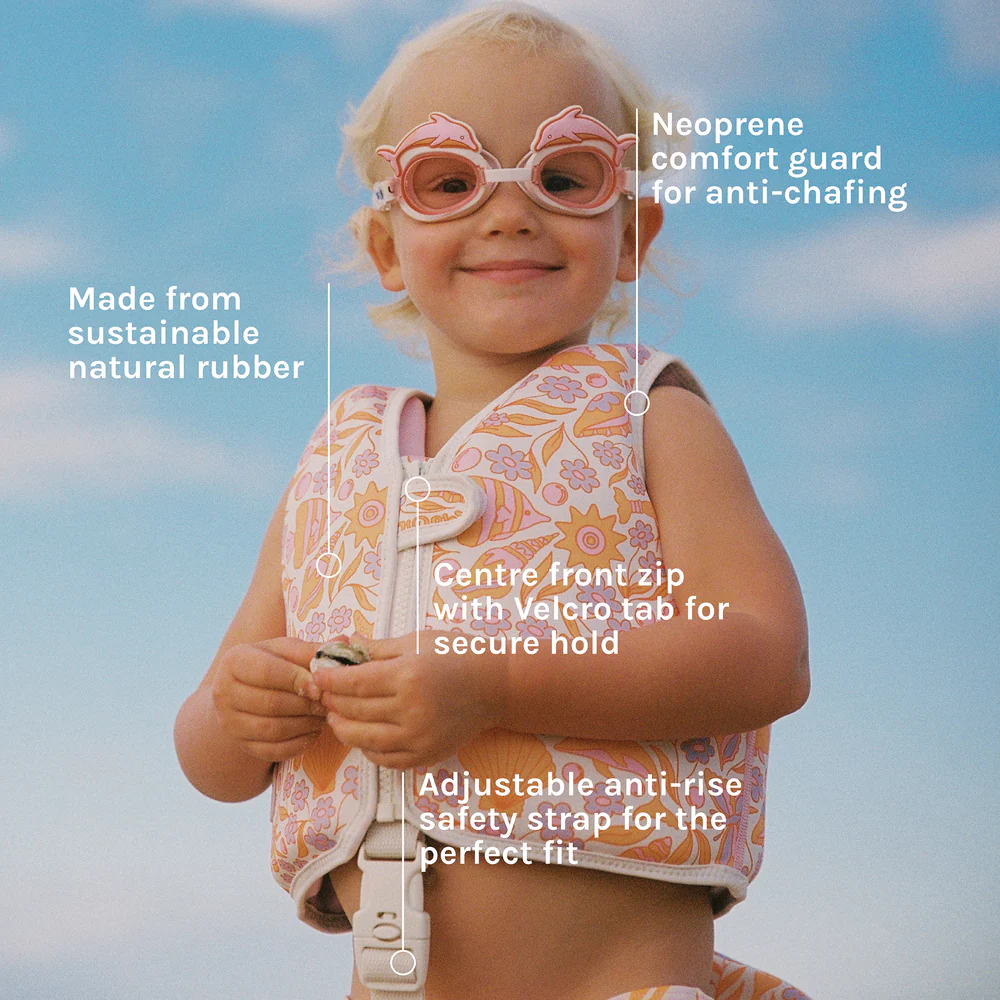 Este chaleco de natación para niños cuenta con una correa de seguridad anti-elevación, protección de neopreno para mayor comodidad y cierre seguro con pestaña de velcro hecho de caucho sustentable para brindar seguridad y confianza a los pequeños aprendices al nadar.