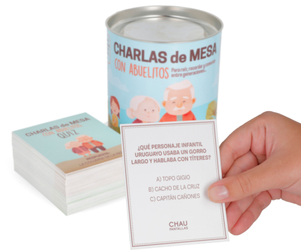 Cada carta invita a la conversación: algunas tienen preguntas sobre los recuerdos del pasado de los abuelos, otras traen desafíos tipo quiz sobre cultura general y también hay imágenes antiguas que despiertan anécdotas y emociones.
