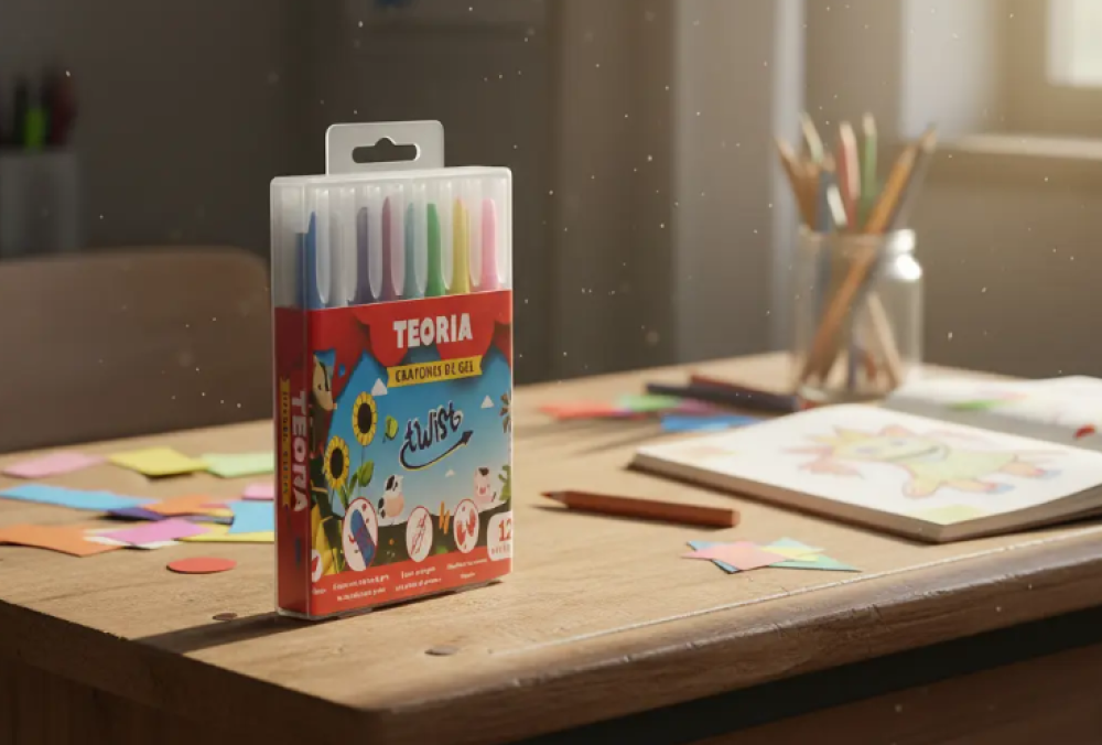 Contiene colores intensos y pastel. Su pigmento vibrante se puede mezclar e incluso utilizar como pintura de acuarela. Cuenta con un sistema de giro en el extremo superior que permite empujar y renovar la punta sin necesidad de afilarla. Su cuerpo es de plástico y mantiene las manos limpias.
