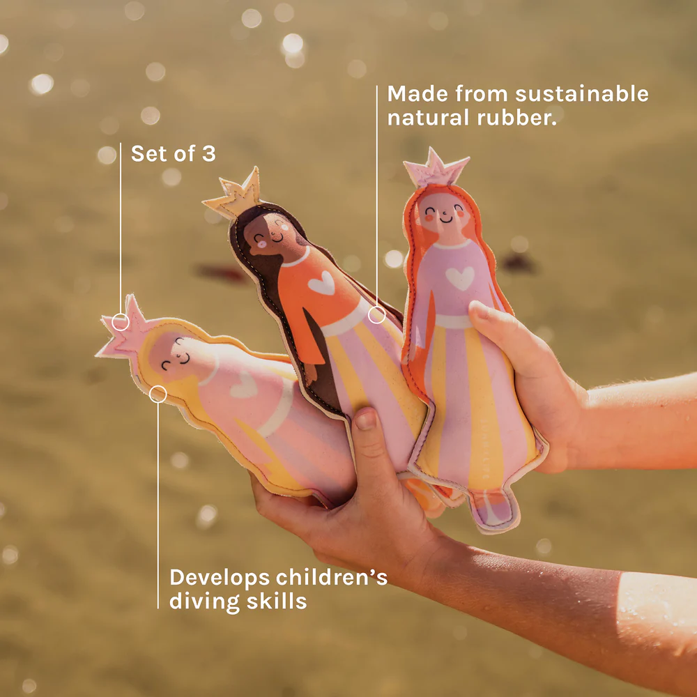 Aptos para todos los niveles, ¡seguro que les sacarán una sonrisa! Disfruta al máximo del verano con este set de 3 majestuosos muñecos de buceo Princess Swan en tonos amarillo dorado, lila, crema y un toque de rosa pastel.