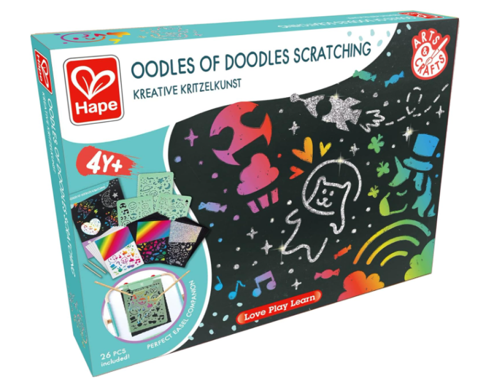 Coloca las plantillas sobre las hojas incluidas y rasca con un lápiz de madera para descubrir las diferentes capas de color que hay debajo. Incluye un póster con consejos y sugerencias. Perfecto para usar en las pizarras Hape.