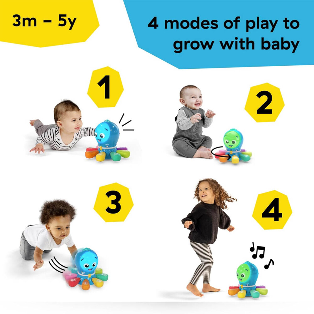 El juguete 4 en 1 Ocean Explorers Go Opus Go de Baby Einstein presenta 4 modos: boca abajo, sentarse y jugar, perseguir y bailar; crece con las necesidades físicas y cognitivas del bebé desde que es un bebé hasta que está en edad preescolar.