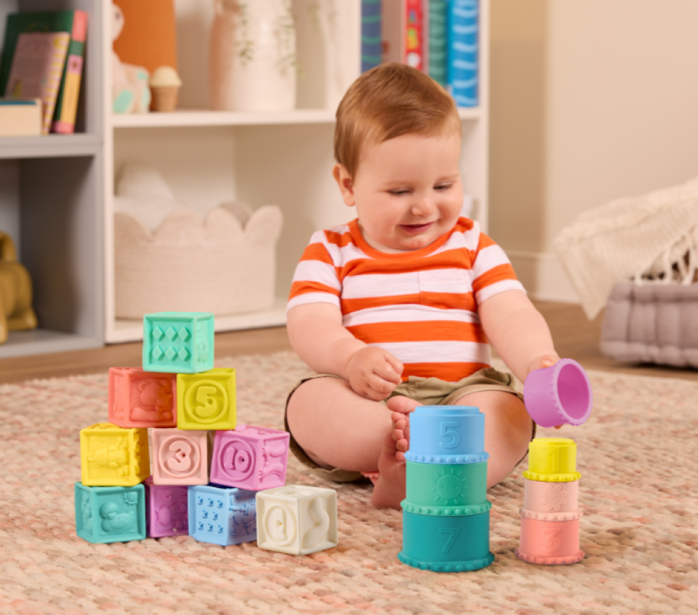 ¡Construye y apila, luego aprieta y vierte con el set Stackin' Squishies de B. Toys!