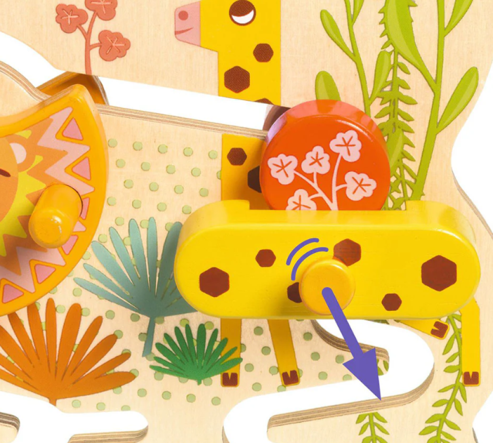 Un laberinto de madera con toboganes y discos deslizantes, para niños a partir de 18 meses. El niño introduce los discos en las "entradas" (3 espacios) en la parte superior del tobogán y luego los deja deslizar hacia abajo. En el centro del laberinto, tres animales detienen los discos. Para liberarlos, el niño debe girar al león, jalar a la jirafa o apartar al hipopótamo para que terminen su alocada carrera.