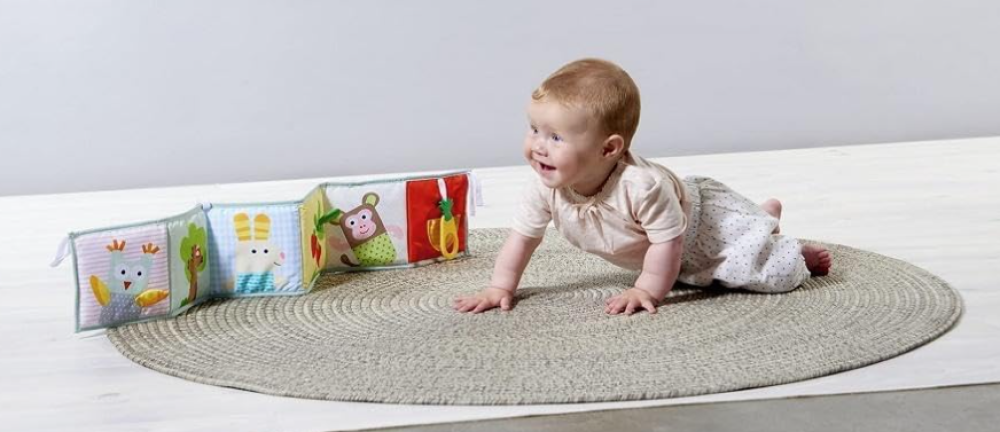 Lado 2: colores intensos, texturas, actividades en 3D que incluyen un mordedor y un bolsillo de juego para desarrollar las habilidades motoras finas del bebé.
