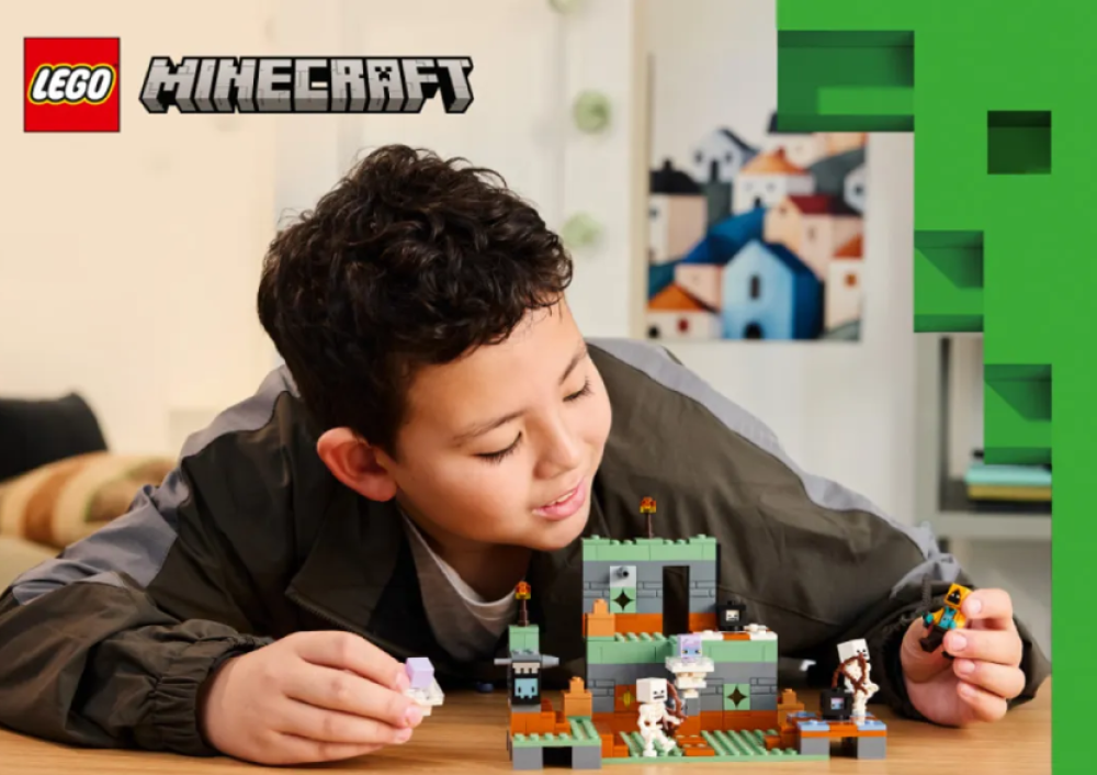 Kit de videojuego LEGO® Minecraft®: Los jugadores deben combatir criaturas y esquivar misiles mientras construyen y juegan para abrirse camino hacia el tesoro entre esqueletos
