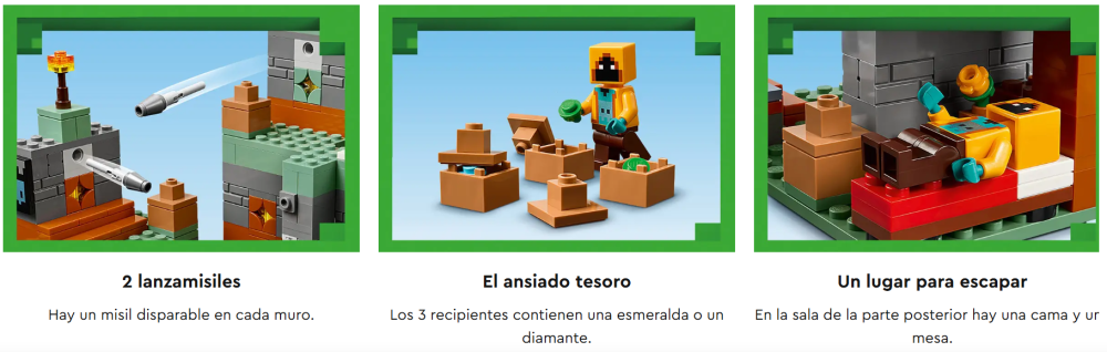 3 recipientes, cada uno con una esmeralda o un diamante en su interior, contienen el ansiado tesoro. Para ofrecer más posibilidades de juego, en la parte posterior del set hay una sala con cama y mesa. Combina el juego físico con la diversión digital que ofrece la app LEGO Builder, que permite a tu peque acercar y girar los modelos en 3D y seguir sus progresos.