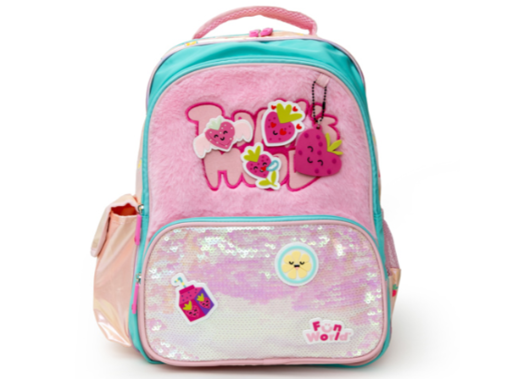Confeccionada en tela holográfica estampada, combina brillo y suavidad en un diseño moderno. Cuenta con bolsillo de lentejuelas, parches de goma con velcro intercambiables, llavero con accesorio y detalles en tela peluche.