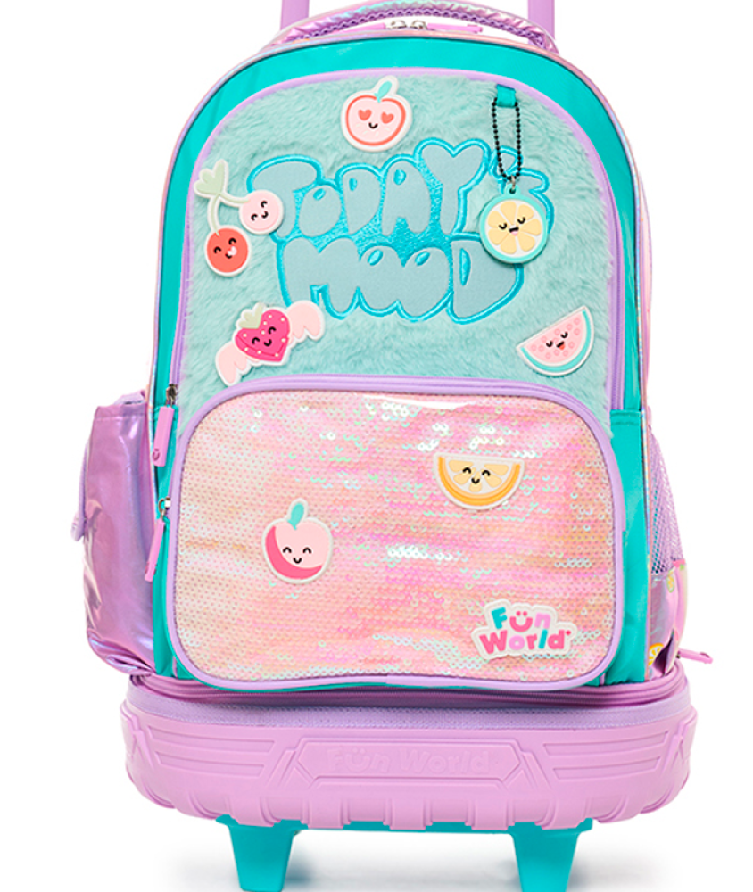 Confeccionada en tela holográfica estampada, combina textura y brillo en un diseño funcional y moderno. Incluye bolsillo de lentejuelas, parches de goma con velcro intercambiables, llavero con accesorio y detalles en tela peluche.