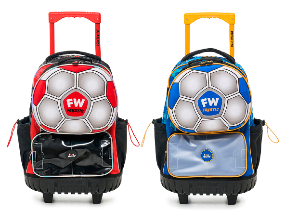 Mochila con carro 46 cm Fanatic Diseñada para brindar practicidad y estilo, incluye bolsillo frontal de PVC, lunchera termoformada desmontable con interior aislante térmico, varios compartimentos y bolsillos, y dos bolsillos laterales para colocar la botella.