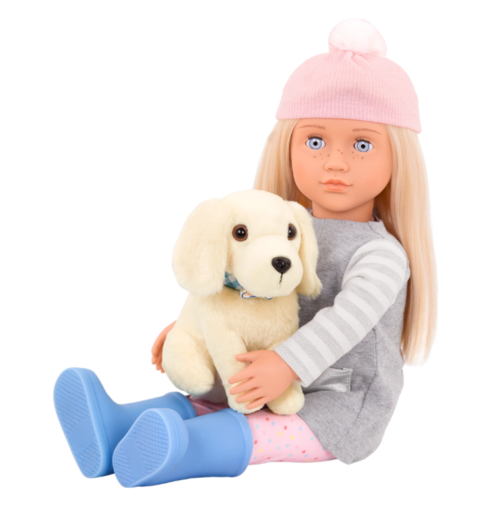 ¡Crea recuerdos inolvidables con la muñeca Meagan de Our Generation y su Golden Retriever! Esta muñeca de 45 cm adora a los perros. Le encanta peinar a su mascota y darle premios cuando se porta bien. Meagan tiene unos preciosos ojos gris azulados que se abren y se cierran, adorables pecas y una larga melena rubia que es muy divertida de peinar. Viene vestida con un cálido vestido gris de punto con dos bolsillos delanteros, leggings de lunares y un gorro con pompón a juego para pasear a su amigo peludo con mucho estilo. ¡Incluso tiene botas de agua azules por si empieza a lloviznar!