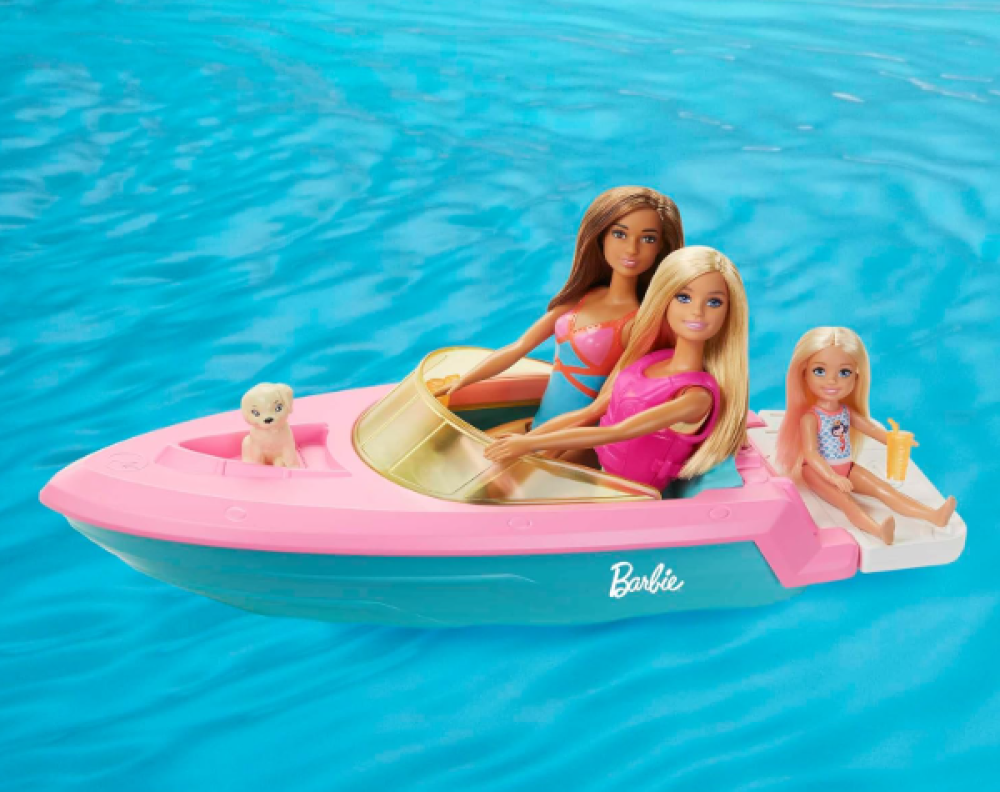 Incluye muñeca Barbie, 1 barco, 1 figura de perrito, 1 chaleco salvavidas y 2 accesorios de bebida.