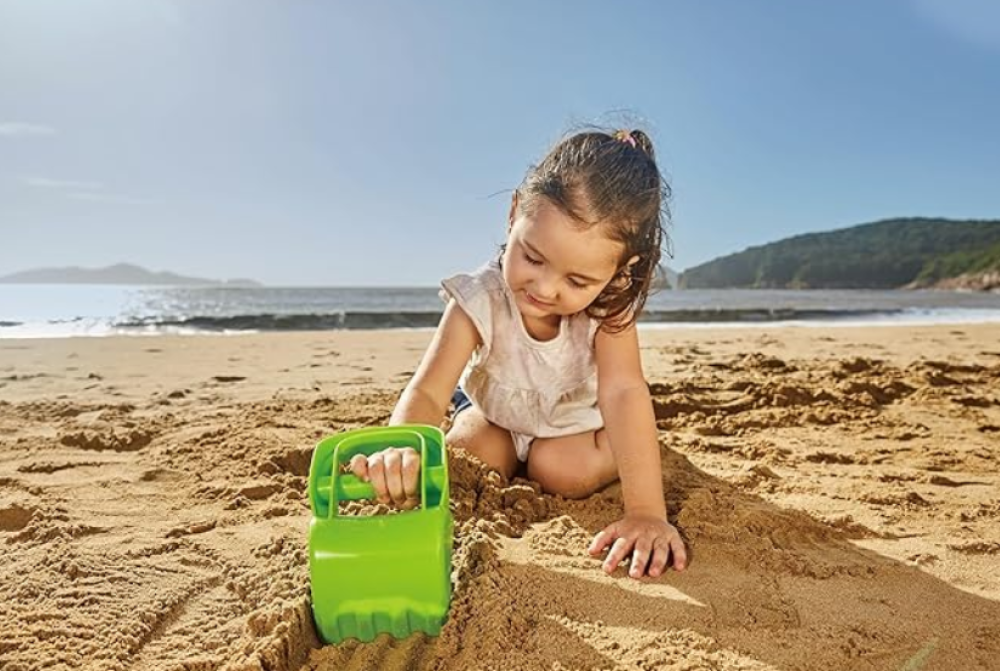 Usa la excavadora para experimentar con volumen, peso y medidas. Añade otros elementos de juego como vasos, conchas, palos, herramientas de jardinería, utensilios y vehículos.