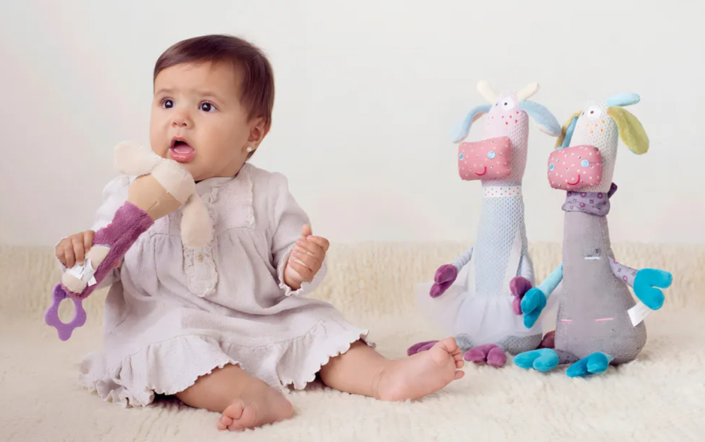 - Los colores y texturas del peluche son variados, proporcionando una experiencia sensorial rica para el bebé.
