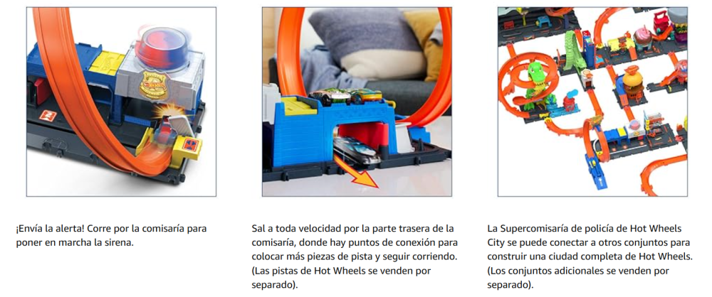 - Mueve el looping regulable para elegir entre cuatro resultados diferentes en el conjunto juego Supercomisaría de policía de Hot Wheels City.