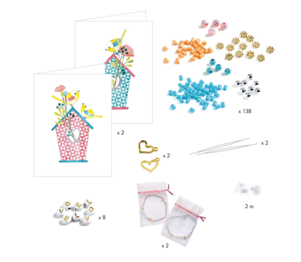 Este set contiene 350 cuentas, 2 charms, 2 metros de hilo elástico, 2 agujas, 1 folleto de instrucciones, 2 bolsas de organza y 2 tarjetas ilustradas.