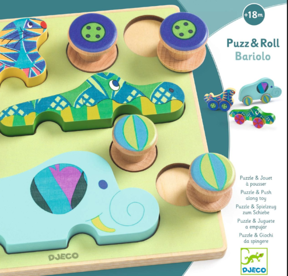 Puzz & Roll son dos juegos en uno: un rompecabezas de madera y un juguete con ruedas.
