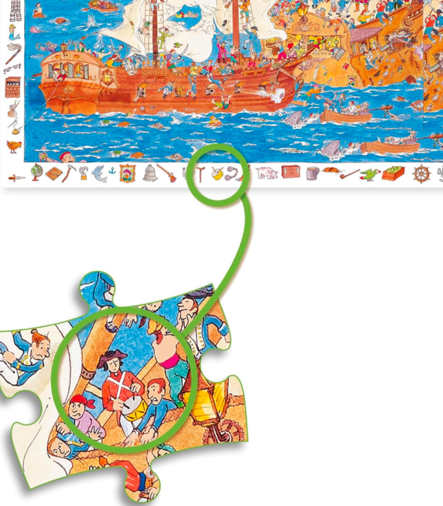 Comienza montando las piezas del puzzle y luego diviértete buscando los elementos del dibujo en la imagen central.