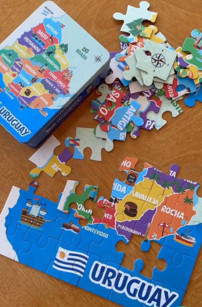 Contiene 48 piezas de cartón, el puzzle viene en una hermosa lata con motivos de Uruguay