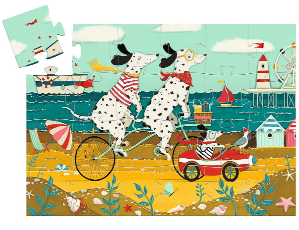Ollie, el dálmata, va a pasar un día en la playa con sus padres. Este colorido rompecabezas de 24 piezas viene en una preciosa caja con forma de perro.