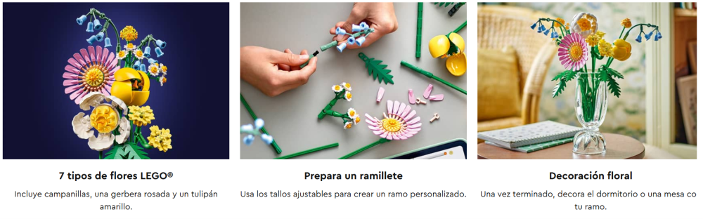 - Flores LEGO®: El ramo se llena de vida con 7 especies de flores primaverales en tonos pastel que representan craspedias, campanillas, helechos, milenrama amarilla, una gerbera, una peonía y un tulipán