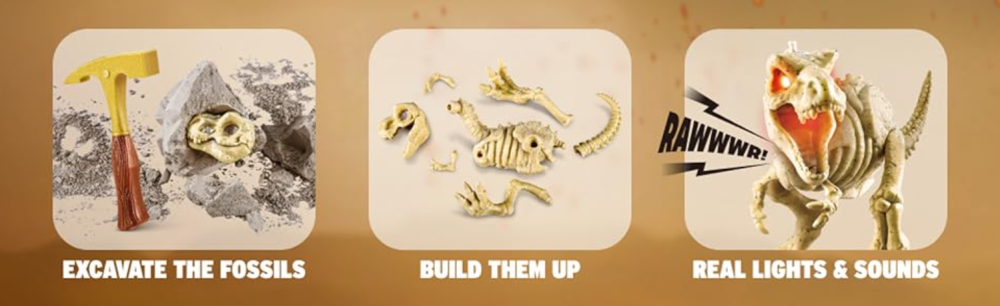 Excava entre capas de espuma fósil y limo de magma para encontrar los huesos de dinosaurio ocultos. Ensambla las piezas para revelar uno de los cuatro posibles dinosaurios, con ojos que brillan en rojo al terminar. Es una emocionante experiencia práctica que combina la diversión de excavar con la emoción de construir tu propia criatura prehistórica.