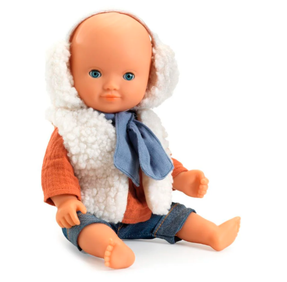 Un conjunto invernal acogedor para ponerse al salir al frío: un chaleco de borrego, orejeras para protegerse del viento frío y una bufanda de gasa de algodón.