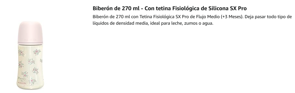 1 Biberón de 270ml, Tetina fisiológica SX PRO +3m con flujo M (Medio) y válvula anticólicos