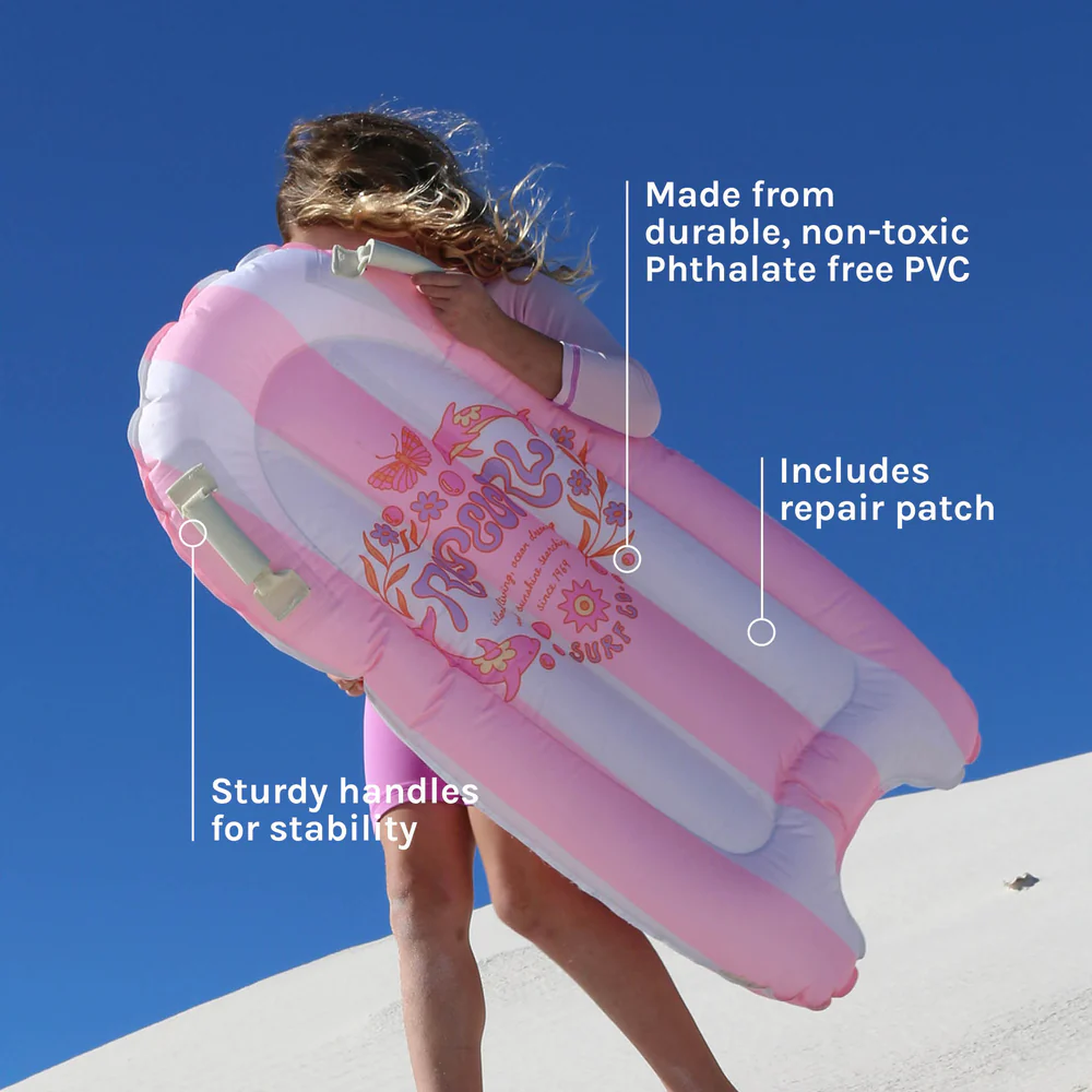 La colchoneta de surf infantil es ligera y fácil de transportar, ideal para disfrutar de divertidas aventuras en la playa y juegos acuáticos. Además, cuenta con asas resistentes para mayor estabilidad.