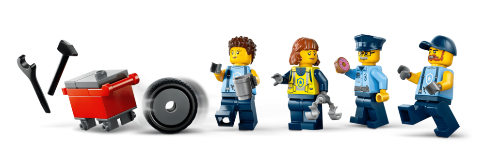 - Accesorios para minifiguras: Este juego de juguetes de policías viene con divertidos accesorios LEGO®, como una llave inglesa, un martillo, unas esposas, un dónut y una taza