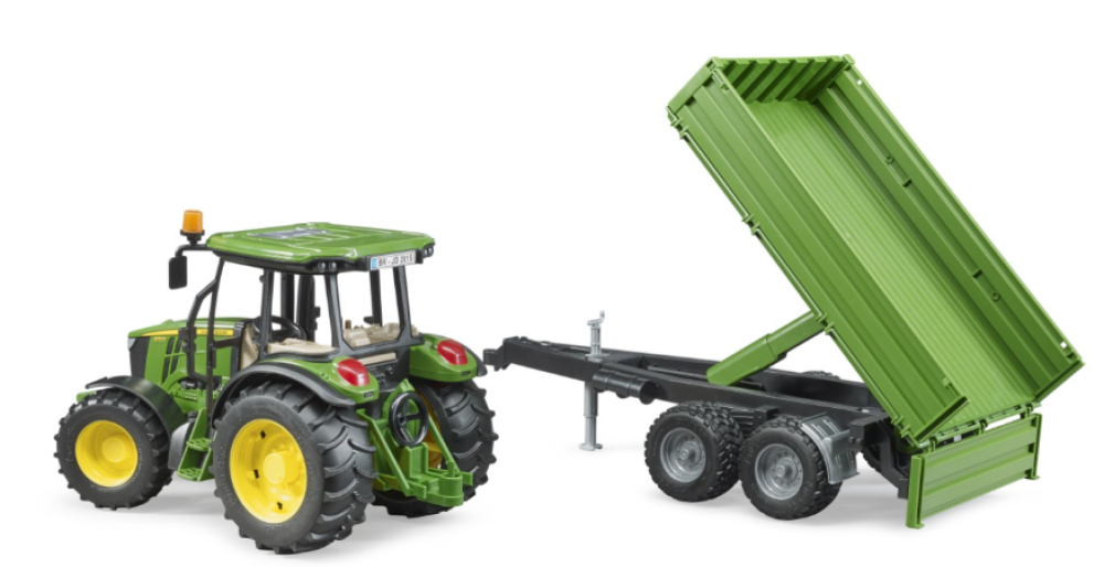El John Deere 5115M se puede dirigir mediante la barra de dirección adicional, tras colocarla en el volante móvil a través del techo corredizo. Este modelo también está a escala 1:16, lo que permite crear un entorno de juego muy atractivo con muchos productos BRUDER. El contrapeso delantero extraíble, junto con el enganche de la barra de tiro, permite acoplar numerosos implementos y remolques de toda la gama. Este set también incluye un remolque con plataforma elevadora en los colores de John Deere.