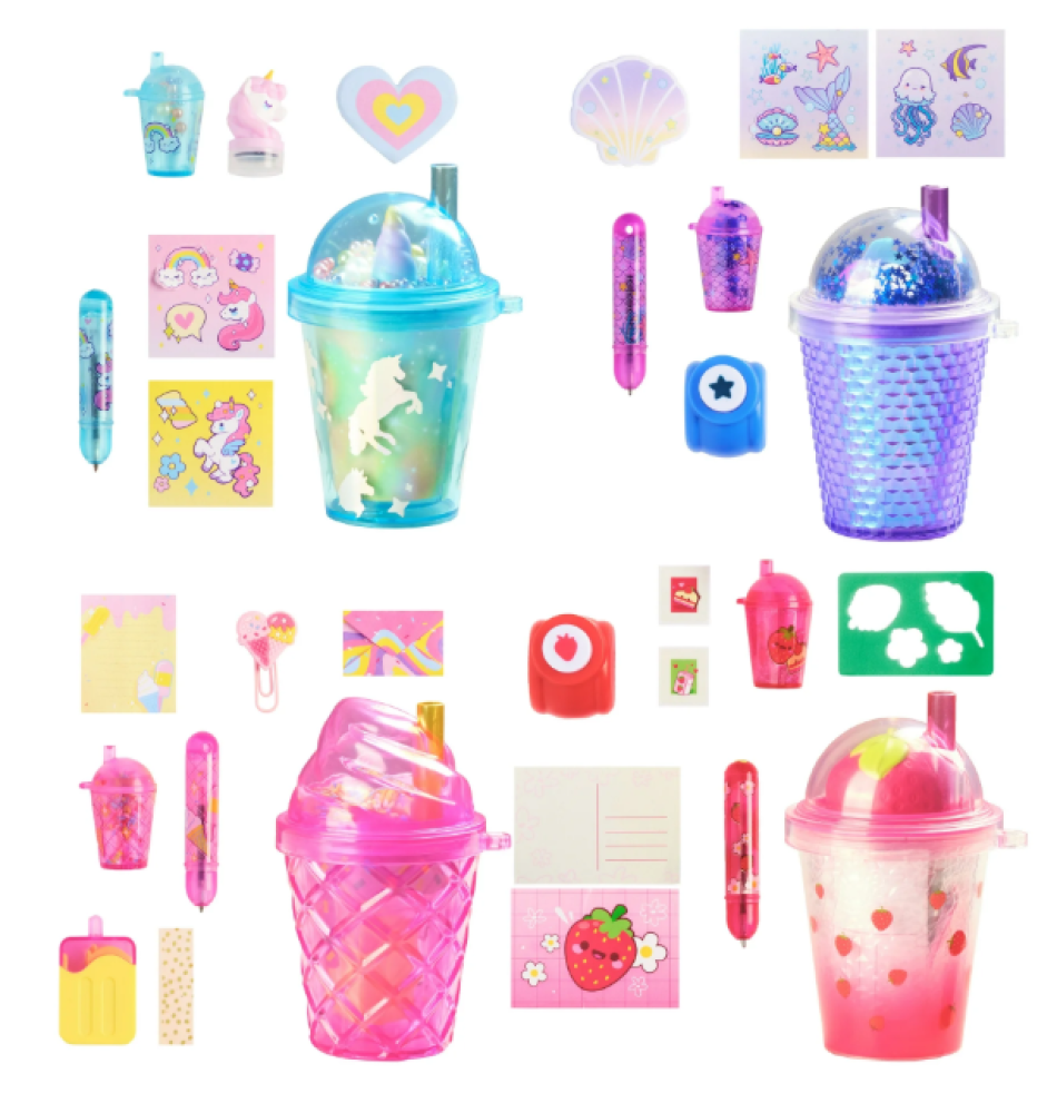 Real Littles Cute Cups es una adorable vaso con contenido divertido. El paquete incluye utensilios de escritura (bolígrafo, perforadora, cuaderno) y un dije. ¡Los utensilios de escritura son en formato mini, pero siguen siendo funcionales!