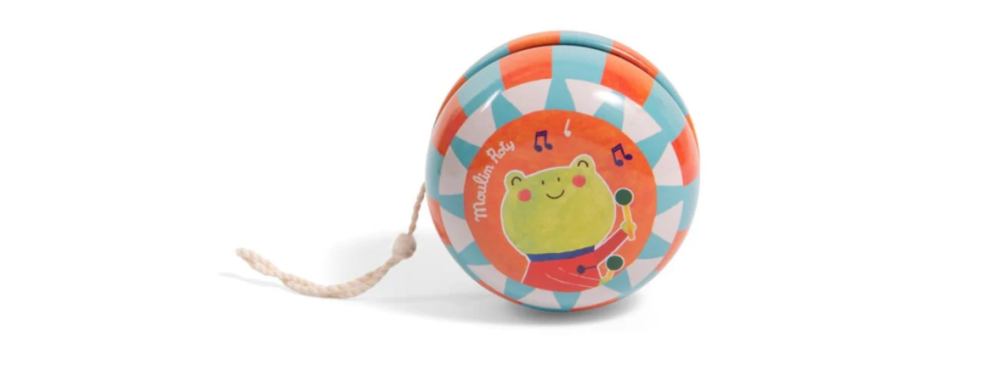 Este yo-yo vintage de hojalata, con sus colores y diseños retro, presenta una rana tocando las maracas, ¡lista para surcar los aires!